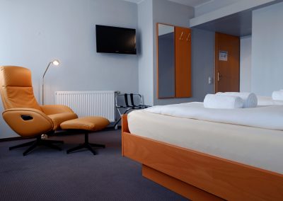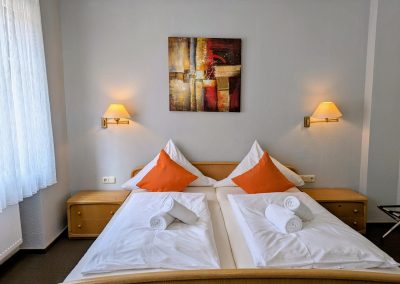 Unsere einladend gestalteten Einzel- und Doppelzimmer verteilen sich auf drei Etagen und bieten Ihnen einen komfortablen Wohnraum. Jedes Zimmer verfügt über ein eigenes Bad mit Dusche/WC und einem Föhn. Genießen Sie moderne Annehmlichkeiten wie einen Flachbild-TV und kostenfreies WLAN.